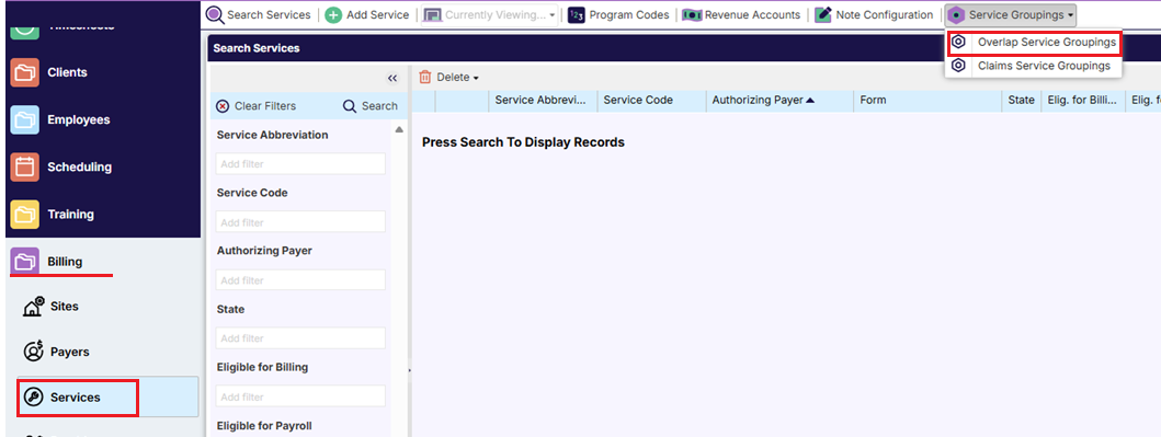 Overlap Service Groupings allows you to specify multiple different group services that can be provided at the same time. By setting up a service group, overlapping service validations will not be presented when these services are provided at the same time. You can also specify a particular service’s pay type that time should import into for payroll cost reporting.