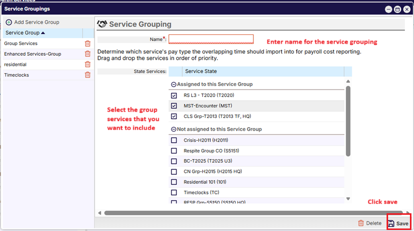 Helpful Hint: You can drag and drop the services in order of priority to determine which service’s pay type the overlapping time should import into for payroll cost reporting.