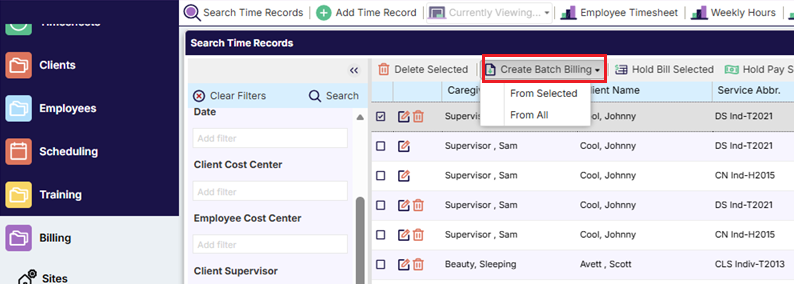 - If validations appear after clicking “Create Batch Billing” either select the time records to override and choose “Override selected validations and continue processing”, or choose “Do not Override and continue processing”