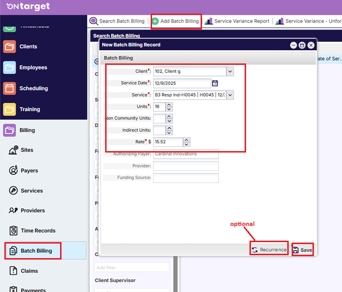- Use the Recurrence feature to add multiple dates of service, or a recurrence of the service.