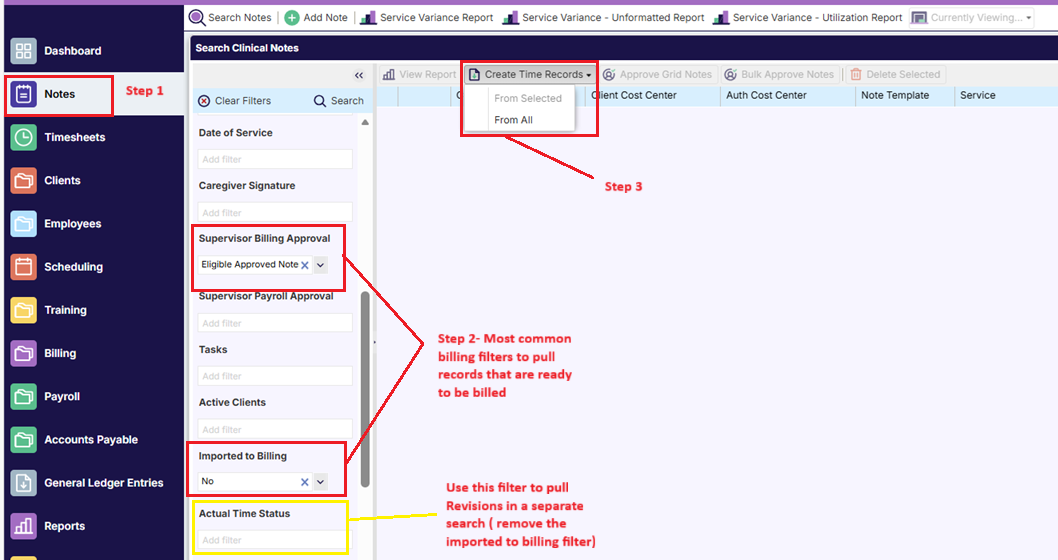 - For billable notes, enter the following filters: Supervisor Billing Approval= “Eligible Approved Notes” and Imported to Billing= “No”.