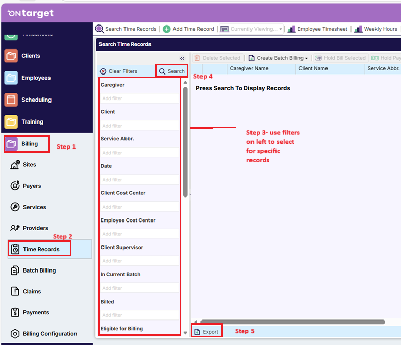 Time Records in OnTarget are defined as the documentation of services provided to each service recipient, specified in actual time (1:00pm to 3:00 pm) or duration only (2:00 hours). Time Records also contain various payroll and billing data; for the purposes of this training, we will refer to billing data only.