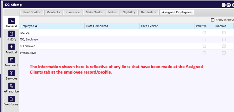 The Assigned Employees tab provides visibility to any links that have been made between a client and an employee. The information shown here is reflective of any links that have been made at the Assigned Clients tab of the employee record.
