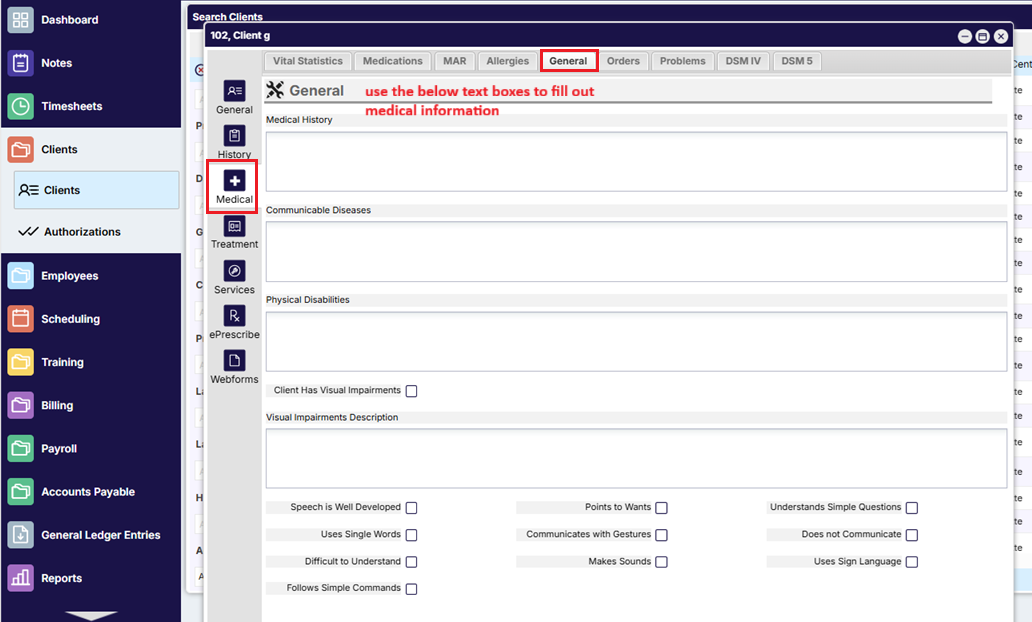 - Note: narrative boxes available include Medical History, Communicable Diseases, Physical Disabilities, and Visual Impairments. A check box is included for Client Has Visual Impairments along with a text box.