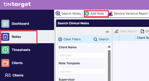- Helpful Hint: To verify which clients are visible in the drop down, go to the Options menu to see if the "Assigned Clients only" box is checked. If this box is checked and the client name required to write a note is not visible, the client will need to be added to the user’s employee record under the Assigned Clients tab.