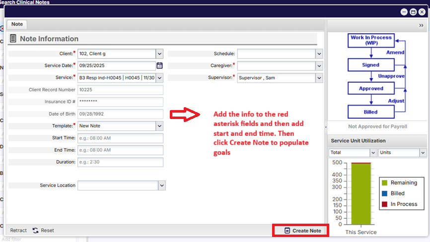 - Note: Once you click Save, the note grid will populate with any goals and outcomes associated with the service selected.