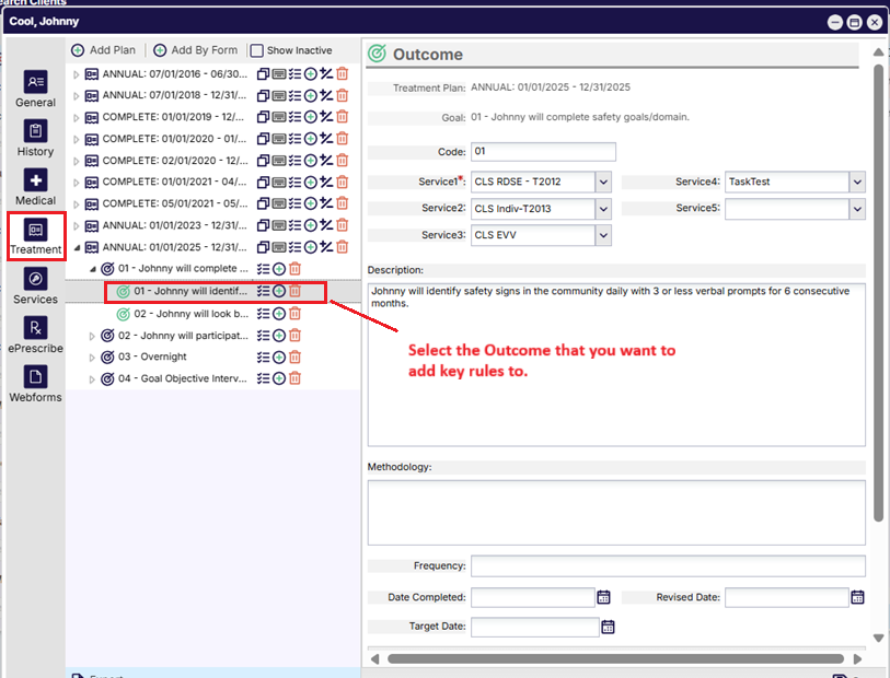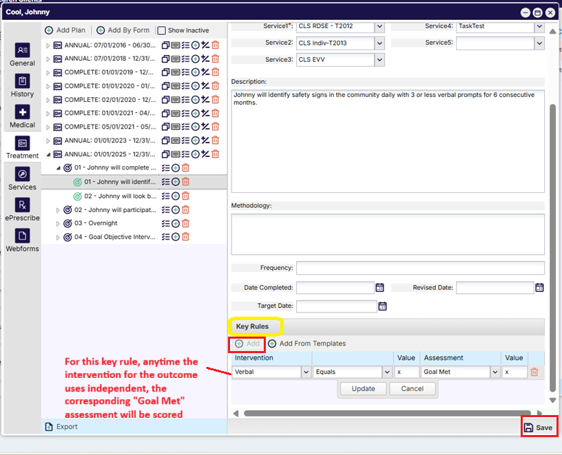 - Helpful Hint: This is where you add Key Rules that are specific to a particular Outcome. If you need to apply Key Rules that are standard for a particular intervention, assessment and service combination, it would be best to setup a Key Rule Template. (See the “Adding Key Rule Templates for Grid Notes” course).