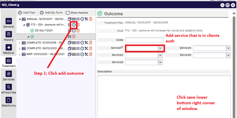 - Helpful Hint: Each goal will need to link to a service in order for it to display on the note. Without connecting a goal to a service, the system will not have the capability of syncing it to a note.