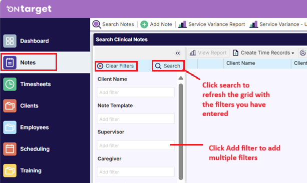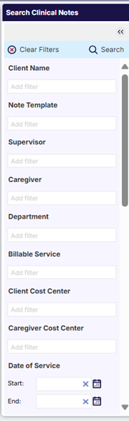 The notes search grid is where you can search for particular notes using filters to restrict the search results. The following is an overview of the clinical-related filters that are available in the system. Note: all billing and payroll-related filters are discussed in a separate course.
