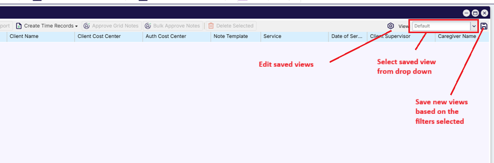 1. Saving: With the desired search filters entered from the Notes search grid, click on the Save icon (upper right corner) to save a view