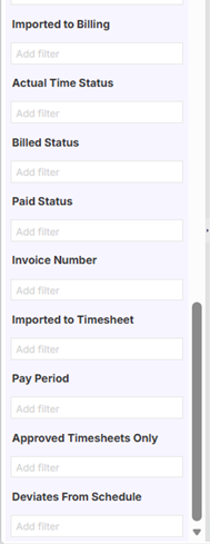 - Actual Time Status- this filter helps restrict notes based on the time status of the note, your selections are “ok, revision and or blocked” This is helpful when wanting to filter notes that are in revision and or blocked prior to being billed.