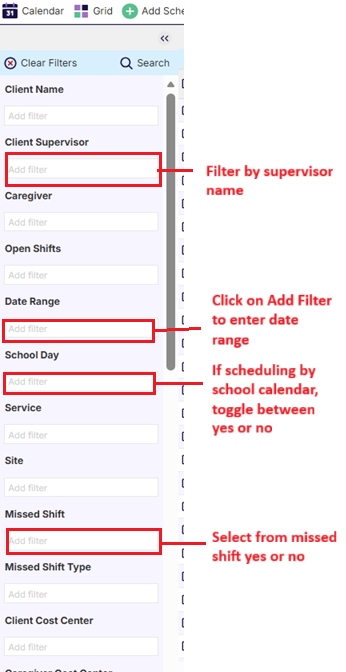 Although the default scheduling view is the calendar view, there is an alternate view and method of schedule entry and management called the grid view. The Grid view offers additional filters and a grid- based view of schedules that may be a preferred method of entry and review in certain situations.