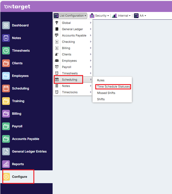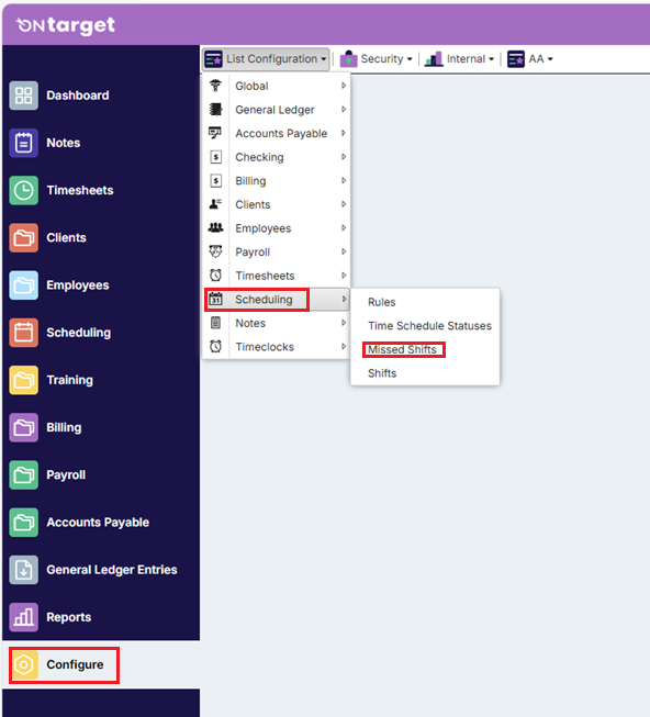 OnTarget has enhanced the functionality for marking scheduled events as missed by introducing advanced configurations for Missed Shift Reasons. Additionally, this capability has been extended to users with Read-Only access to the Scheduling module, allowing them to designate a scheduled service as missed prior to creating a service note or clocking in for an EVV-scheduled service.
