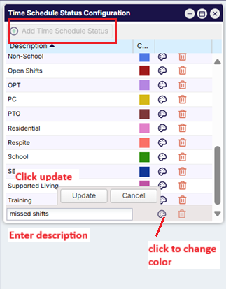 - Helpful Hint: You can change the default color for the schedule status by clicking on the color palate icon. Although there is a great deal of flexibility with the schedule status setup/coloring, statuses that relate to missed shifts are often coded w/ a single color for simplicity of workflow.
