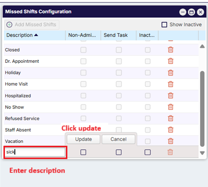 When marking a scheduled service as missed, users can select a configurable reason to indicate the cause of the missed shift. These reasons are managed through the “Missed Shifts” List Configuration (Configure > List Configuration > Scheduling > Missed Shifts), which allows for full customization to meet organizational needs. OnTarget has enhanced this configuration by introducing additional options designed to streamline and simplify the process.