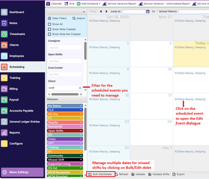 - Helpful Hint: You can also mark multiple scheduled events as missed shifts by using the Bulk Edit function.