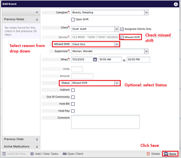- Helpful Hint: By changing a billable scheduled event to a missed shift, any authorized service units that were bound to the scheduled event are freed up.