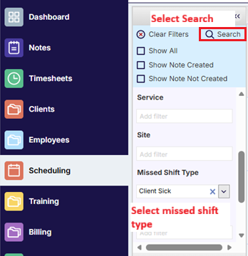 - Helpful Hint: If you have changed the schedule status on a missed shift to one that relates to a missed shift, you can use the Statuses for filtering too.