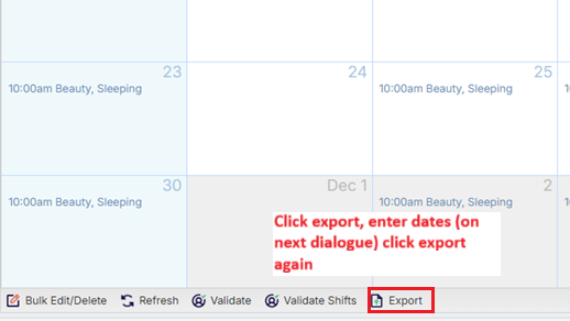 - Enter a date range from the dialogue and click Export again. Note: you can further export to the desired file type from the Schedule Report.