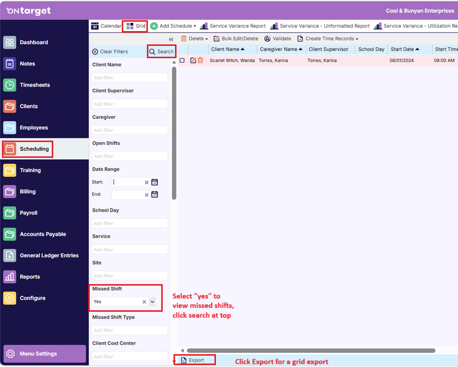 - Helpful Hint: From the Grid view you have the same Missed Shift Type filter available, but you also have a general “Missed Shift” filter. Select “Yes” to search for all missed shifts regardless of type.