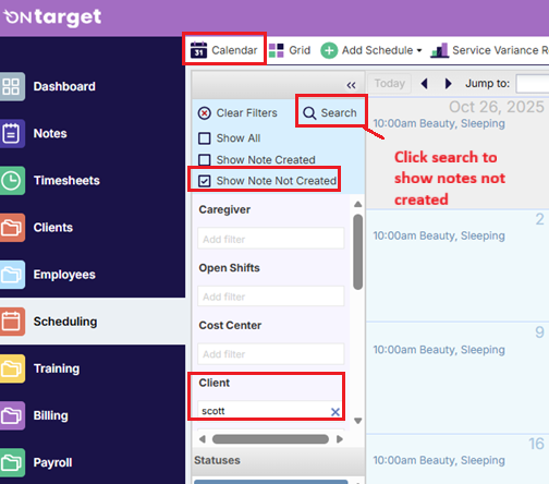 - Helpful Hint: Use any additional filters available from the Calendar view to narrow your search for schedules that are not linked to notes. There is also a “Show Note Created” checkbox if you need to search for schedules that are linked to notes.