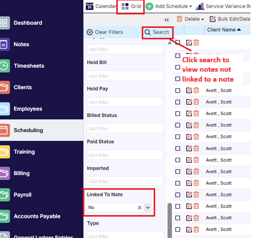 - Helpful Hint: Use any additional filters available from the Grid view to narrow your search for schedules that are not linked to notes. You can also select “Yes” from the “Linked To Note” drop-down if you need to search for schedules that are linked to notes.