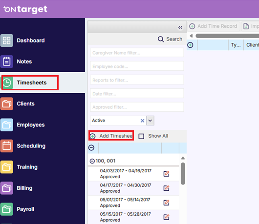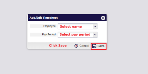 - You may manually create a timesheet if one has not automatically been created, by clicking Add Timesheet. Select the current pay period from the Pay Period drop- down.