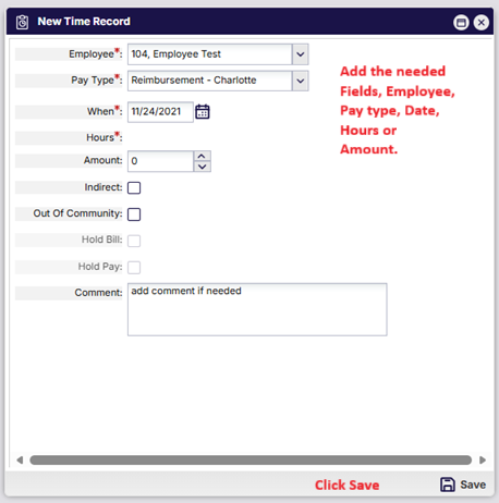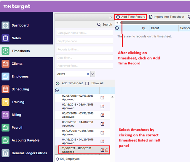 - Click on the Add Time Record button at the top of the timesheet to add any non-billable time.