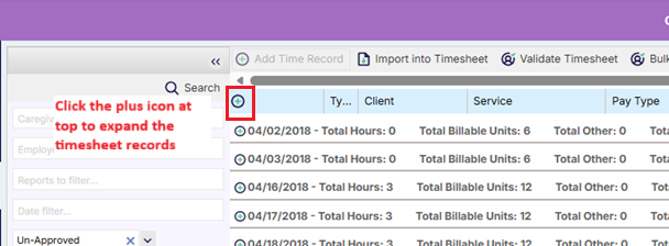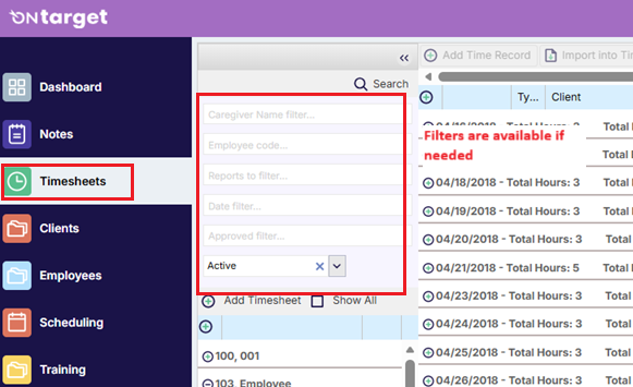 - Use the Timesheets filters if necessary to filter for Caregiver Name, Reports to, or by Date range.
