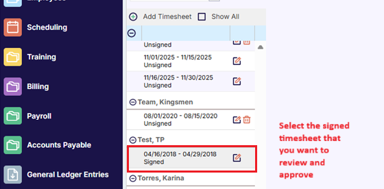 - Helpful Hint: Approved timesheets are ready to be pulled for payroll purposes. If any edits need to occur at this point prior to payroll run, click the Un-Approve button to unlock the timesheet.