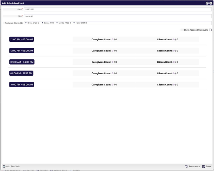 The option to add a Flex Shift remains available and can be accessed by selecting the Add Flex Shift button located in the lower-left corner of the screen. The steps for creating a Flex Shift are unchanged. Once added, the Flex Shift will appear within the updated Shift Schedule window. Caregiver and Client selections function in the same manner as they do for configured shifts.