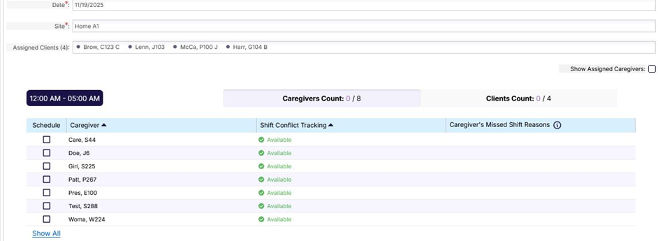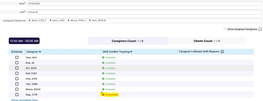- Unavailable – Caregivers marked as Unavailable do not initially appear in the assigned caregiver list for the selected shift. Selecting Show All reveals all caregivers flagged as Unavailable. This indicator identifies caregivers who are scheduled for overlapping shifts within the same site, across different sites, or during conflicting time periods.