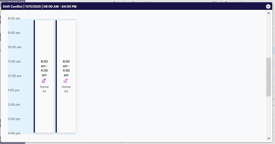 Selecting the checkbox next to a caregiver assigns that individual to the corresponding shift. To improve scheduling accuracy, a Shift Conflict Tracking column has been introduced, providing visibility into potential conflicts for caregivers who may have overlapping shift times within the same site or across multiple sites. The Shift Conflict Tracking column displays one of the following indicators: