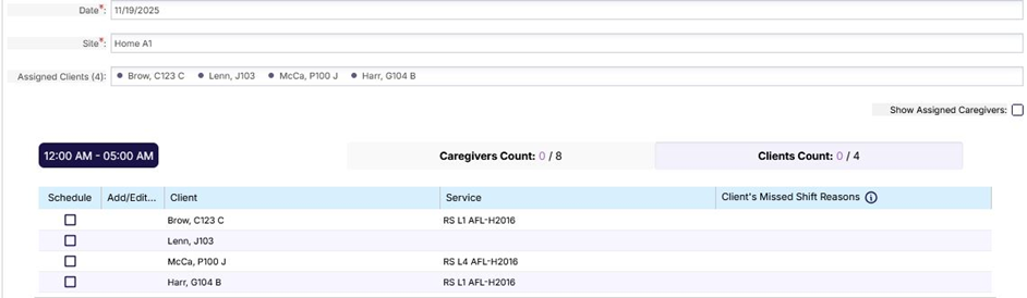 Similar to assigning caregivers to a corresponding shift, clicking the “Clients Count” column header displays the clients associated with the Shift Site, allowing users to select those present during the scheduled shift. The client’s default authorized residential service is automatically populated to streamline the selection process.
