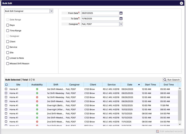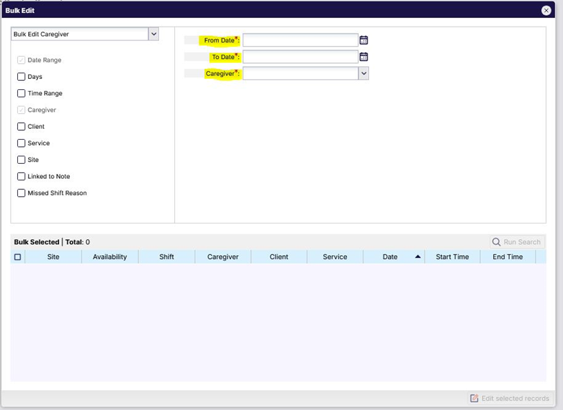 The Bulk Edit Shift Schedule window enables users to apply specific search criteria to display relevant results for editing assigned Caregivers.