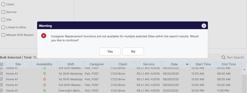 - Replaced By – Replaces the assigned Caregiver with a newly selected Caregiver for the selected shift schedules.