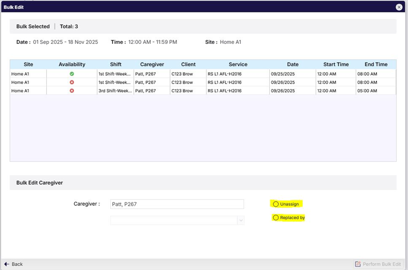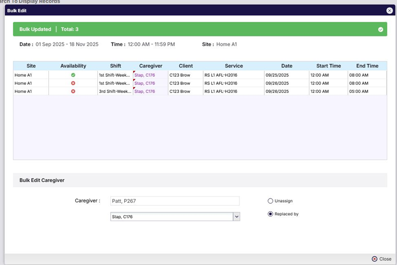 Please Note: When using the ‘Replace By’ edit option, a drop-down menu of caregivers assigned to the site is provided to select the desired caregiver.