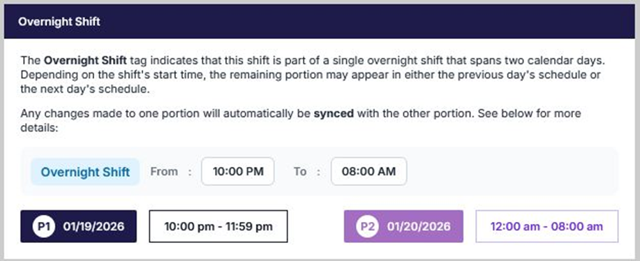Although the overnight shift is divided into Before Midnight and After Midnight segments, any edits or changes made to one segment are automatically synchronized with the linked segment.