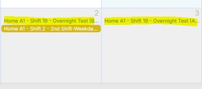 Saving a Shift Schedule that includes an active overnight shift automatically creates a second, linked shift schedule within the Scheduling Calendar. This linked schedule represents the second portion of the overnight shift. Within the Scheduling Calendar, the two portions are identified in the shift title as Before Midnight and After Midnight.