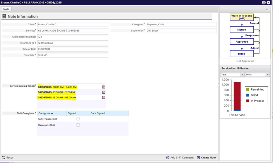 Similar to Overnight Shift Notes, when a Daily Shift Note is created, all shifts for the selected date are automatically added to the service note. Users may edit the start and/or end times of the multiple shifts included within the single Shift Note.