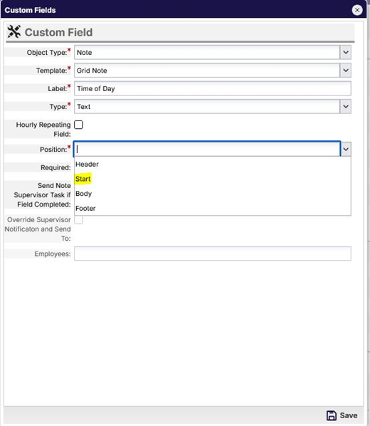The process for configuring custom fields remains unchanged. When creating a new custom field or modifying an existing one, users can now select the Start option within the Position field to designate the field’s placement at the beginning of the service note.
