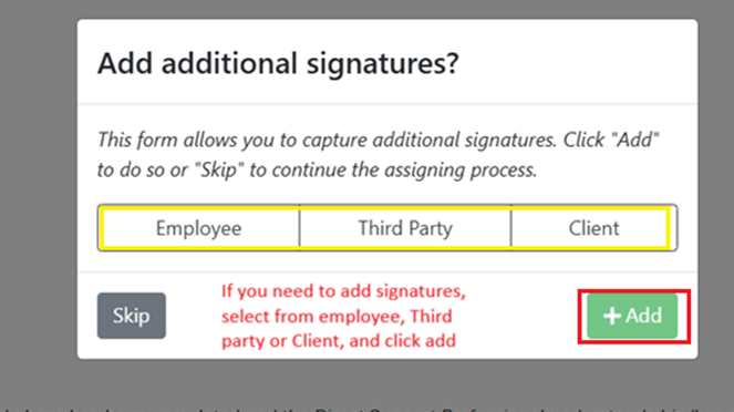 3. If additional signatures are required, you will be prompted to select the signer type (Employee, Third Party, or Client).
