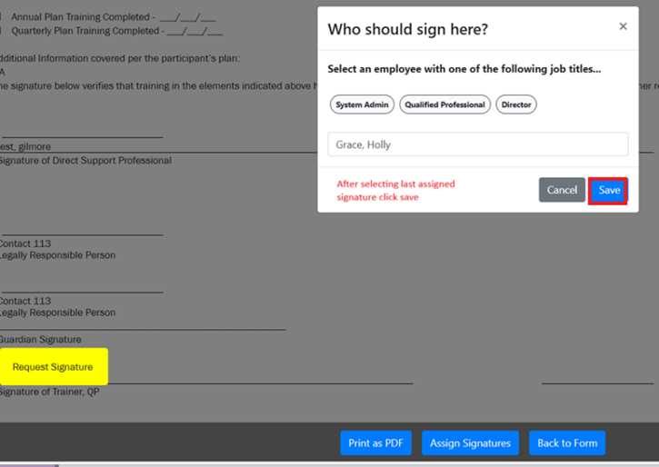 4. Type the signer’s name in the field provided and select the correct name from the dropdown list. Then click “Save.”