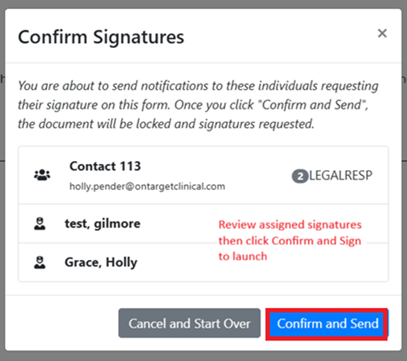 5. After all signatures have been assigned, you will be prompted to review the document, click “Confirm and Send.” If all signatures are assigned are correct, should you need to edit any assigned signatures, click “Cancel and Start Over” to return to assign signatures.