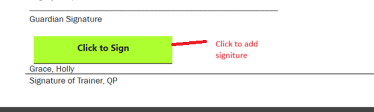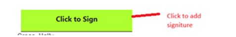 - Review the document, fill out any need information and scroll to green “Click to Sign”.