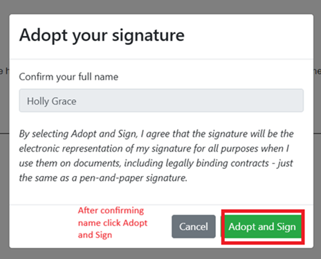 - Confirm your name and click “Adopt and Sign.”