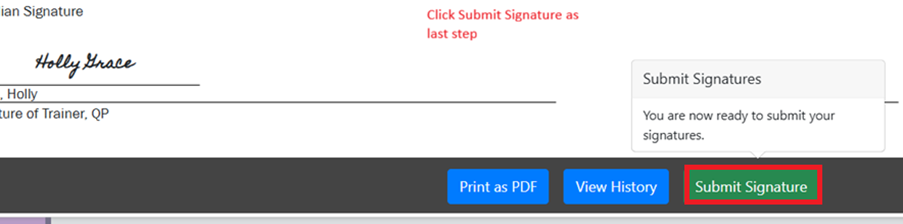 - You will see your signature appear on the document then click, “Submit Signature.”