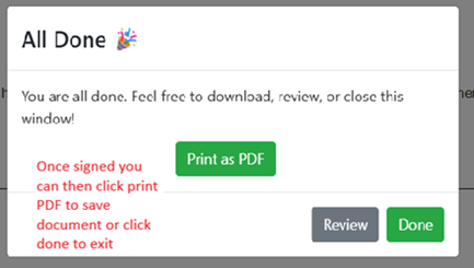 - After signing, if you’d like to print a copy, click “Print as PDF.” If the document is still awaiting other signatures, you can choose to wait until it’s fully completed. Once all signatures are collected, you can access the webform again under “My Tasks” or from the original location where it was launched. A copy is automatically saved and stored in OnTarget where launched.