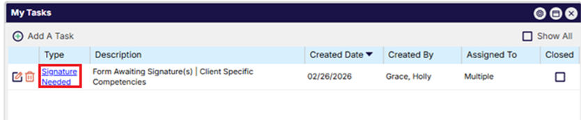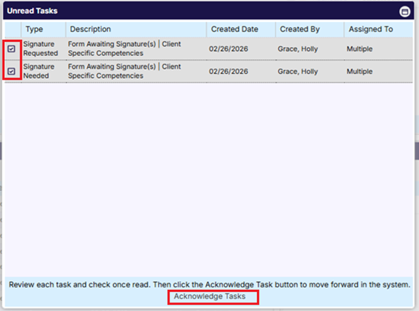 - Select the boxes and click “Acknowledge Tasks” for signature requested tasks. (Note: all tasks must be selected to click acknowledge and move to dashboard).