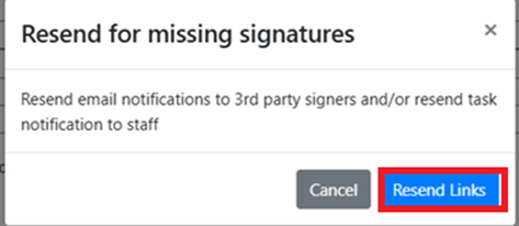 - Click “Resend for missing Signatures” to resend to any assigned signatures that have not signed webform. Click, “Resend Links”